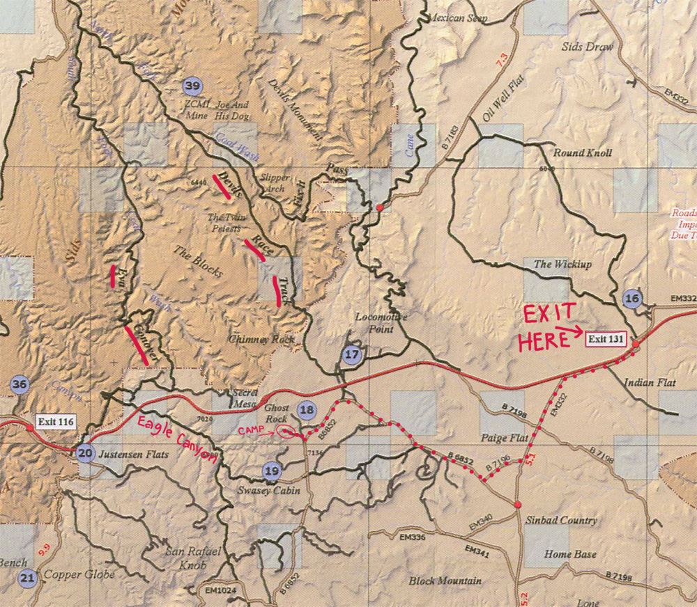 From Exit 131: Travel west on the dirt road that parallels the Interstate on the south side (EM332) to the junction (N38°50'37.15"-W110°42'16.72") with dirt road B7196, turn right. Follow until the junction (N38°50'13.24"-W110°43'18.20") with B6852, turn right. Follow dirt road B6852 until you reach the turnoff for our campsite. The turnoff (N38°50'56.42"-W110°47'44.15") to our campsite will be marked with both a "Lone Warrior Rock Art" official BLM sign as well as a temporary "Swell Overnighter" sign that we will place. Continue west for approximately 1/2 mile at which point our site should be visible (Campsite: N 38° 51' 8.890", W 110° 48' 3.090"). We will be monitoring both the CB & HAM in case you can't find us.